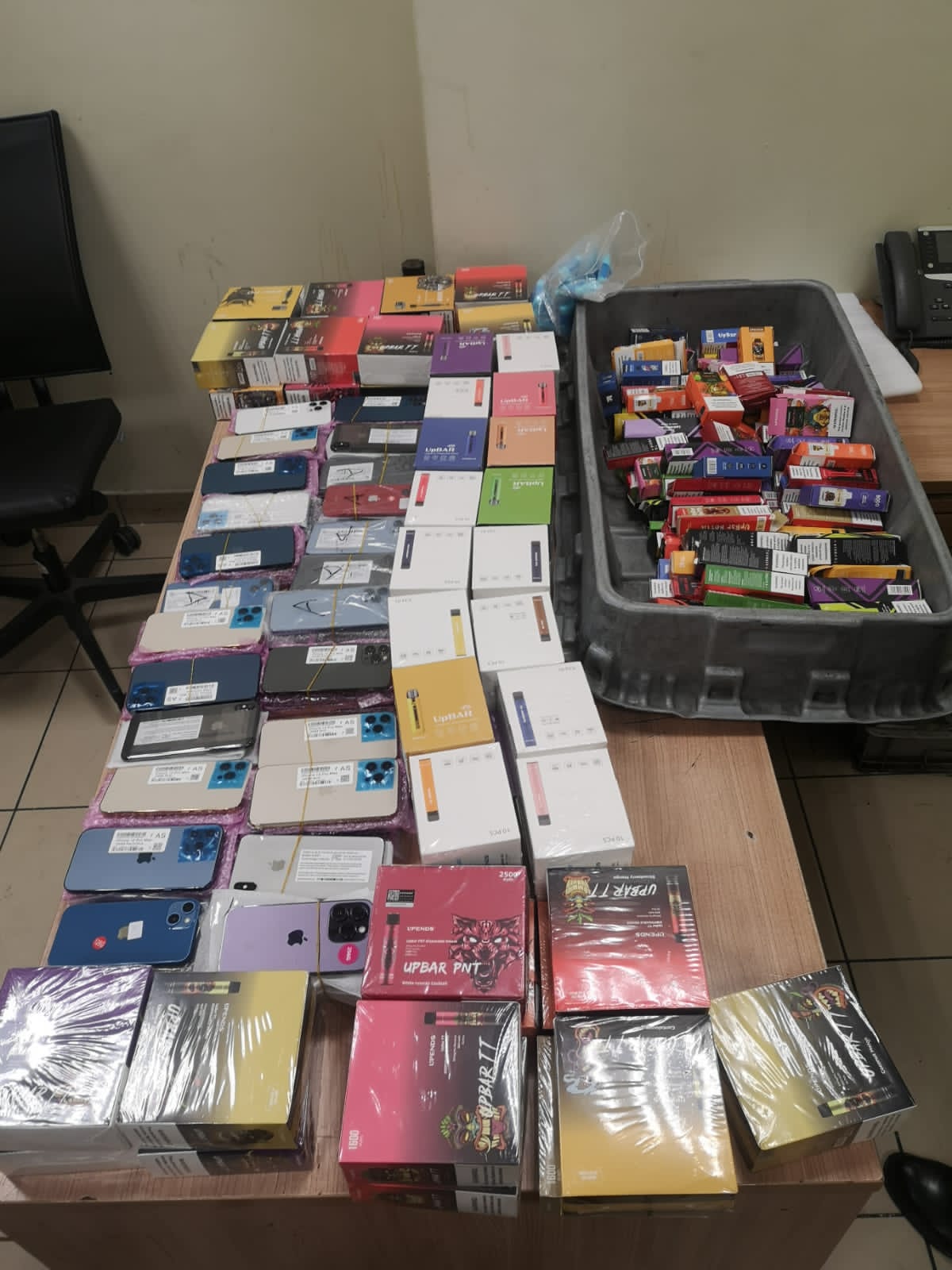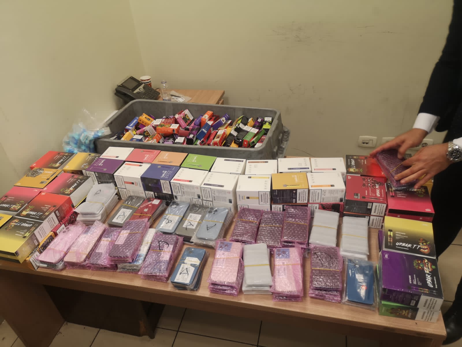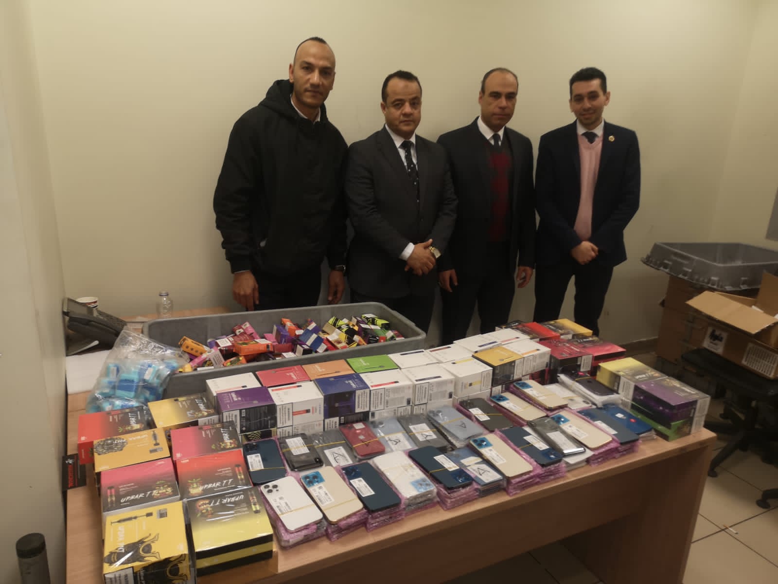 وتم تكليف لجنة مكونة من سامي نبيل وشيرين كمال الدين وأحمد عنتر مآمير الجمرك لاستكمال التفتيش وعد وتصنيف وتحريز المضبوطات التي بلغ عددها 100 تليفون محمول، و180 عبوة من السجائر الإلكترونية ومستلزماتها.
