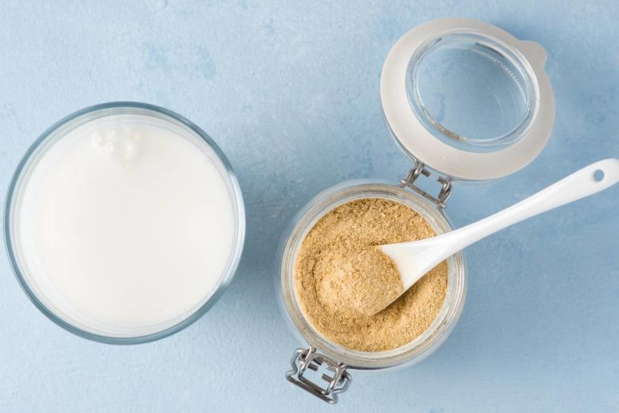 الخطوة الثانية: ضعي الخميرة والسكر في كوب الحليب الدافئ وقلبي الخليط بملعقة ليتجانس وتذوب الخميرة في الحليب ثم اتركيه مغطاة لمدة 5 إلى 10 دقائق.