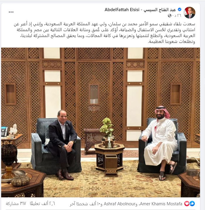 السيسي: سعدت بلقاء شقيقي سمو الأمير محمد بن سلمان.. وأؤكد على عُمق ومتانة العلاقات الثنائية بين مصر والسعودية