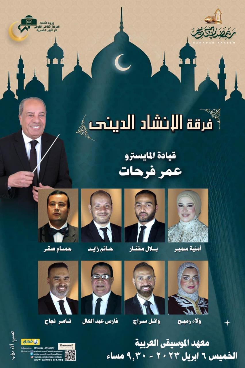 وفي نفس التوقيت، على مسرح معهد الموسيقى العربية، تقدم فرقة الإنشاد الديني حفلًا بقيادة المايسترو عمر فرحات، يضم مجموعة من الأناشيد والابتهالات، منها، صلاة الله على المختار، رمضان جانا، أشرقت أنوار محمد، من نور رحاب الحسين، يا طيبة، هلت ليالي، روح الوجود، القلب يعشق، بشراك يا صايم، صلينا الفجر فين، ابتهال النبي غالي، صلوا على المصطفى، باب الله مفتوح، محمد يا رسول الله، سلام الله يا طه وأسماء الله الحسنى.. أداء أمنية سمير، بلال مختار، حاتم زايد، حسام صقر، ولاء رميح، وائل سراج، فارس عبد العال، تامر نجاح.