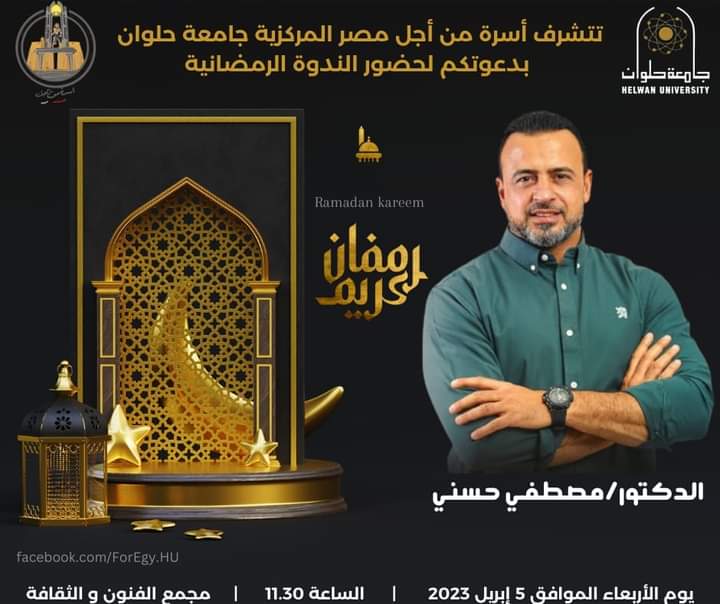 تنظم أسرة من أجل مصر المركزية بـ جامعة حلوان، ندوة رمضانية يوم الأربعاء 5 أبريل المقبل، مشيرة إلى أن الندوة سوف تأتي بحضور الداعية الإسلامي مصطفى حسنى، وذلك برعاية الدكتور السيد قنديل رئيس جامعة حلوان.