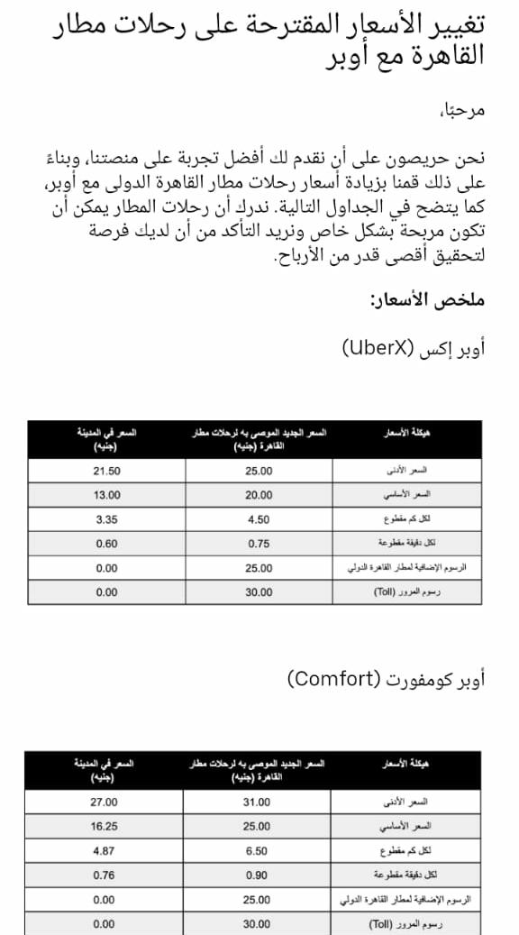 رفعت شركة خدمات النقل الذكي أوبر، أسعار رحلاتها إلى مطار القاهرة، وفقًا لبيان أرسلته الشركة إلى كباتنها عبر البريد الإلكتروني.