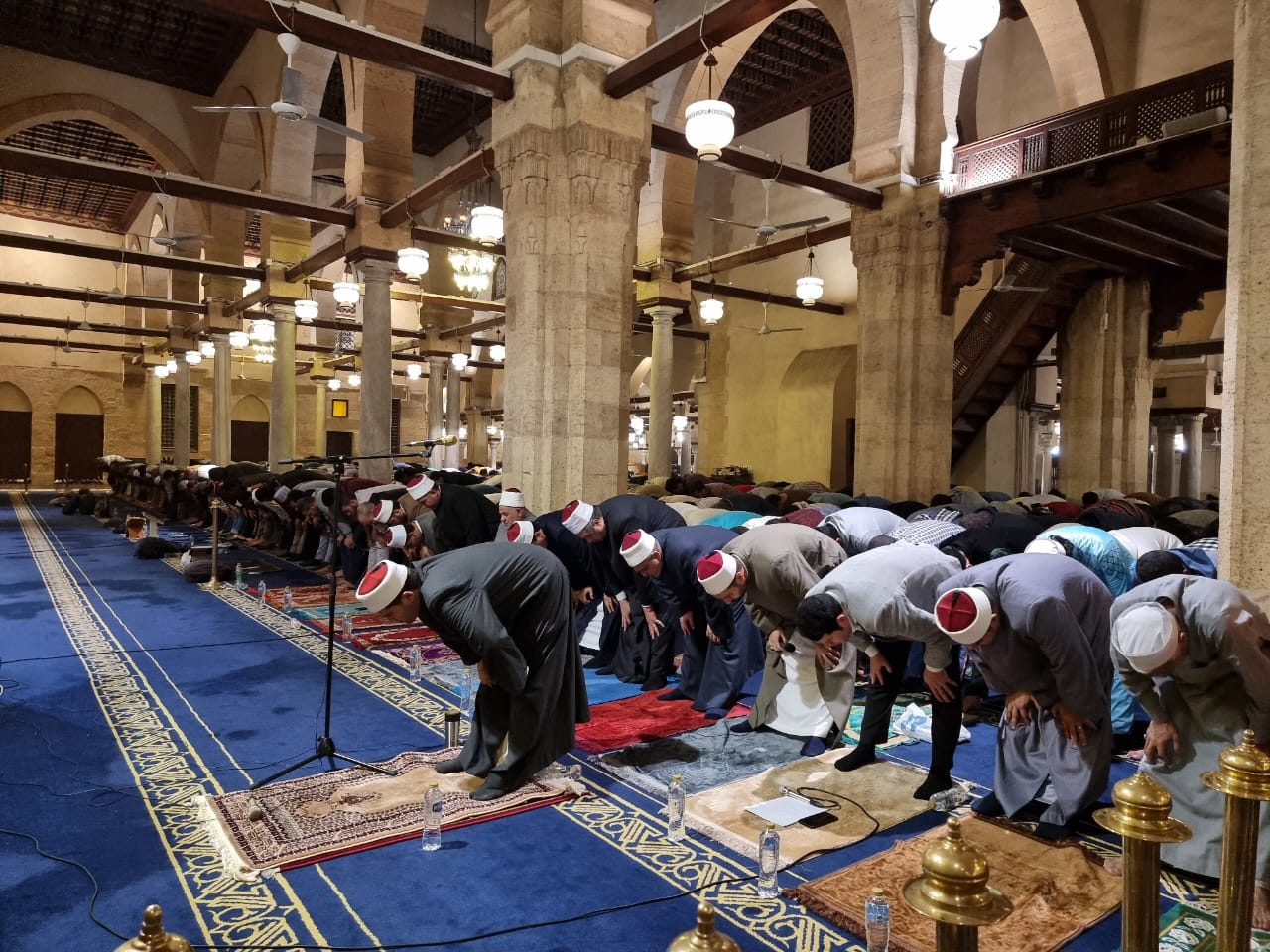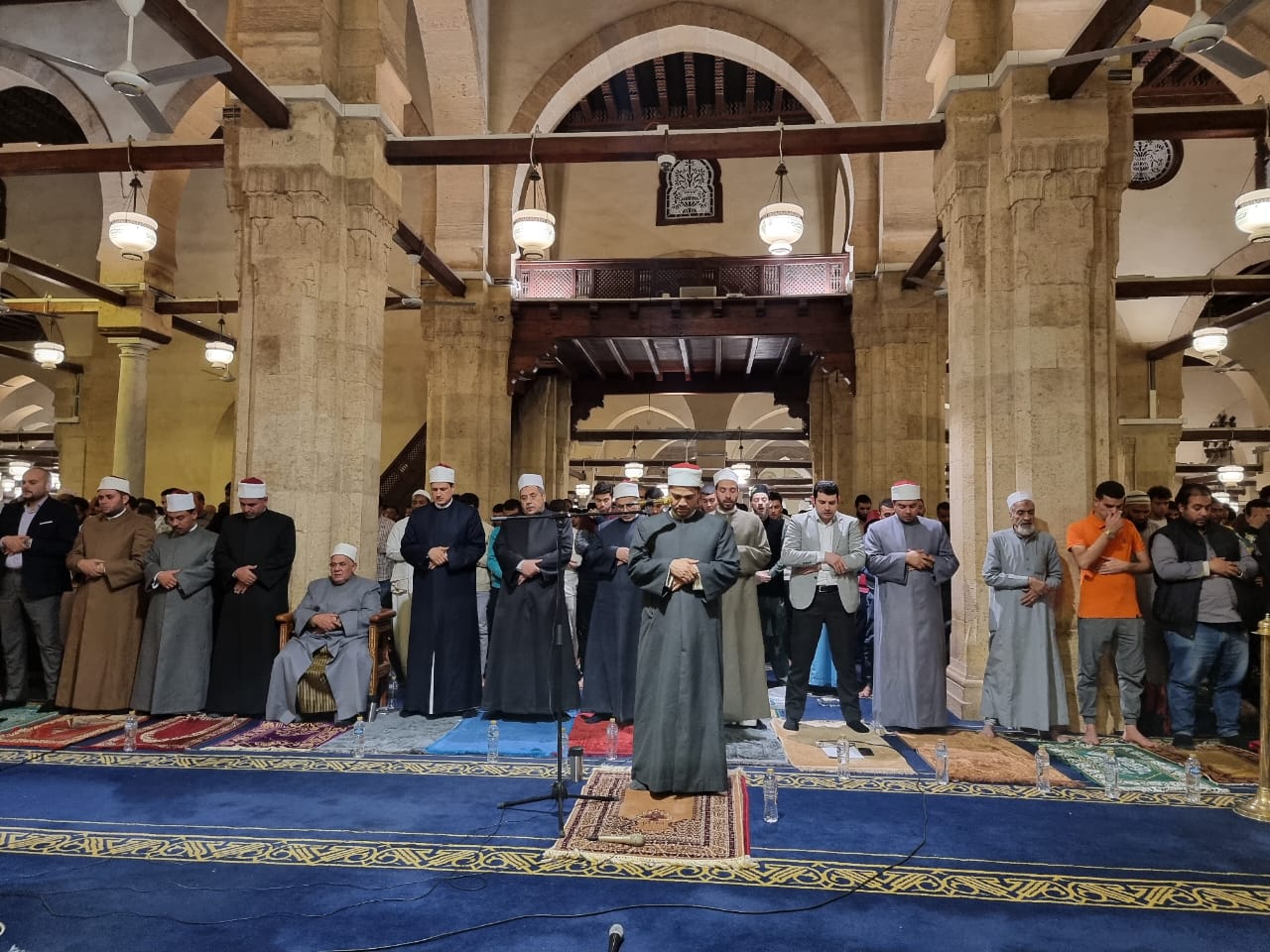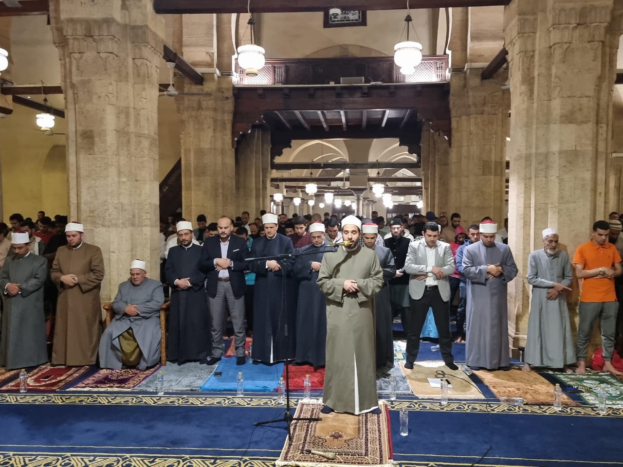 وتقدم المصلين الدكتور سلامة داود، رئيس جامعة الأزهر، والشيخ حسن عبد النبي، وكيل لجنة مراجعة المصحف الشريف، والشيخ أيمن عبد الغني، رئيس قطاع المعاهد الأزهرية، والدكتور هاني عودة، مدير عام الجامع الأزهر، ونخبة من علماء وقيادات الأزهر، وأقيمت صلاة العشاء من سورة يوسف برواية حفص عن عاصم، وأقيمت صلاة التراويح من سور يوسف والرعد وإبراهيم برواية ورش عن نافع المدني، ورواية قالون عن نافع المدني، ورواية ابن كثير المكي.