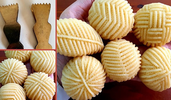 - يترك الكحك مدة ساعة حتى ترتاح العجينة ثم يتم تشكيلها إلى كرات متساوية الحجم وتُنقش بالمنقاش.