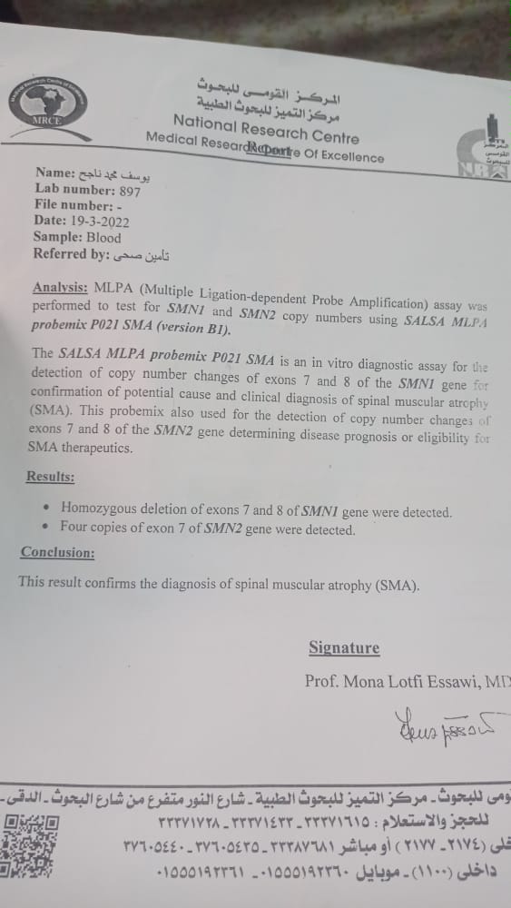 تضيف سارة: بعد إجراء رسم الأعصاب، تأكدنا من إصابته بالضمور العضلي، ولكن التحليل الجيني، أثبت إصابته بالضمور العضلي الشوكي.