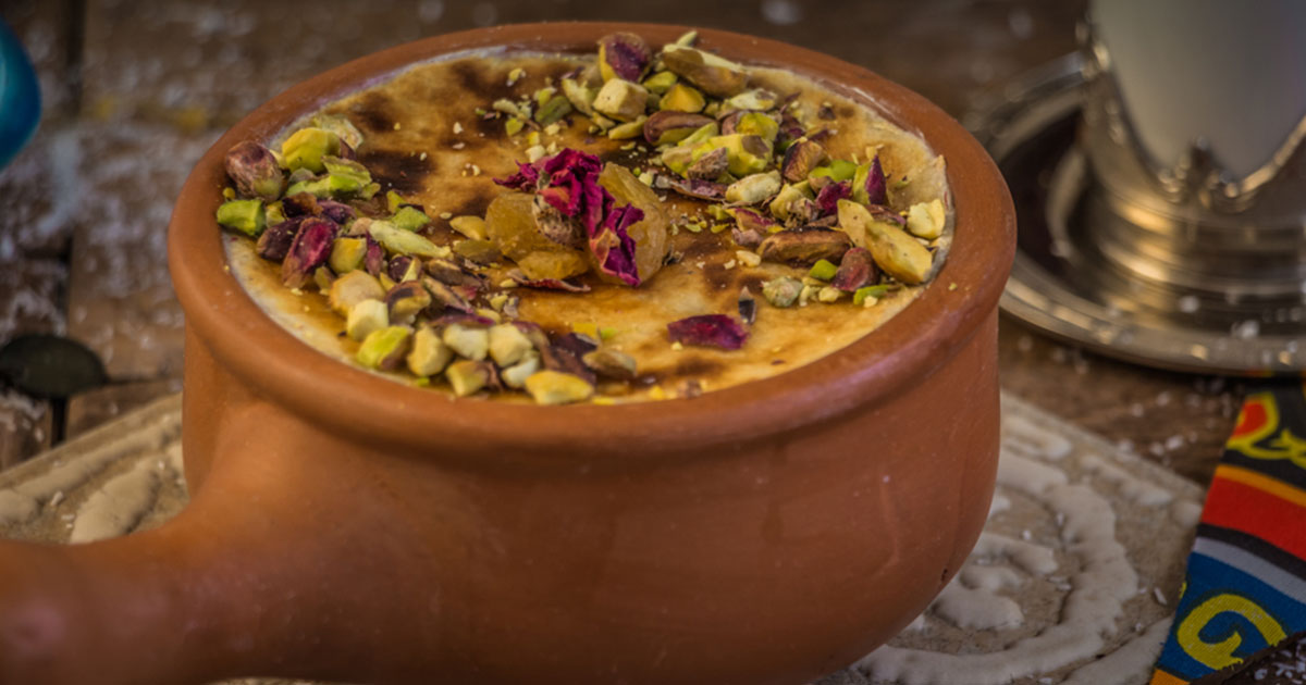 - وعن الخطوة الثالثة يوضع القشطة والزبدة فوق طاجن أم على، ثم يوضع في الشواية لمدة 2 دقيقة، يخرج من الفرن يزين بالفستق، وتقدم أما ساخنة أو باردة.