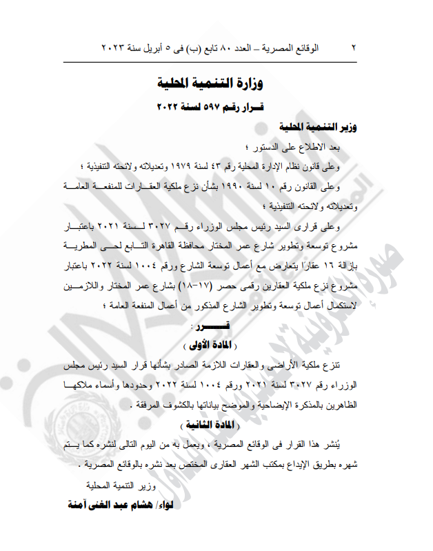 وأضاف القرار: بعد الاطلاع على قراري رئيس مجلس الوزراء الدكتور مصطفى مدبولي رقـم 3027 لـسنة 2021 باعتبـار مشروع توسعة وتطوير شارع عمر المختار محافظة القاهرة التـابع لحـي المطريـة منفعة عامة، وإزالة 16 عقارًا يتعارض مع أعمال توسعة الشارع.