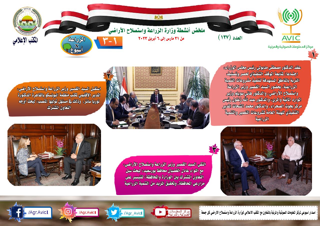 وخلال هذا الأسبوع استقبل السيد القصير وزير الزراعة واستصلاح الأراضي، المدير الإقليمي لمكتب منظمة اليونسكو بالقاهرة الدكتورة نوريا سانز، وذلك في مستهل توليها المنصب؛ لبحث أوجه التعاون المشترك، كما التقى مع اللواء عادل الغضبان محافظ بورسعيد؛ لبحث سبل التعاون المشترك بين الوزارة والمحافظة؛ للتيسير على مزارعي المحافظة، وتحقيق المزيد من التنمية الزراعية، كذلك أعلن الوزير أنه تم خلال الفترة من 24/3/2023 حتى 30/3/2023، الإفراج عن 160 ألف طن من الذرة وفول الصويا بنحو 80 مليون دولار.