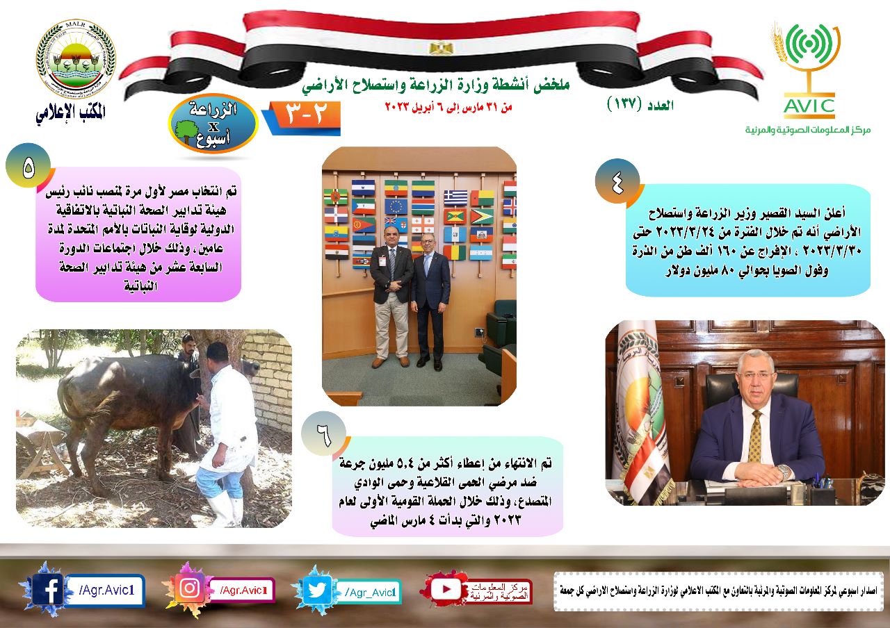 فيما تم الإعلان عن انتخاب مصر لأول مرة لمنصب نائب رئيس هيئة تدابير الصحة النباتية بالاتفاقية الدولية لوقاية النباتات بالأمم المتحدة لمدة عامين، وذلك خلال اجتماعات الدورة السابعة عشر من هيئة تدابير الصحة النباتية، كما تم الانتهاء من إعطاء أكثر من 5.4 مليون جرعة ضد مرضي الحمى القلاعية وحمى الوادي المتصدع، وذلك خلال الحملة القومية الأولى لعام 2023 والتي بدأت 4 مارس الماضي، وأعلن أيضا صندوق التأمين على الماشية أنه تم التأمين على أكثر من 650 ألف رأس ماشية تأمين صحي عادي حر خلال العام الحالي.