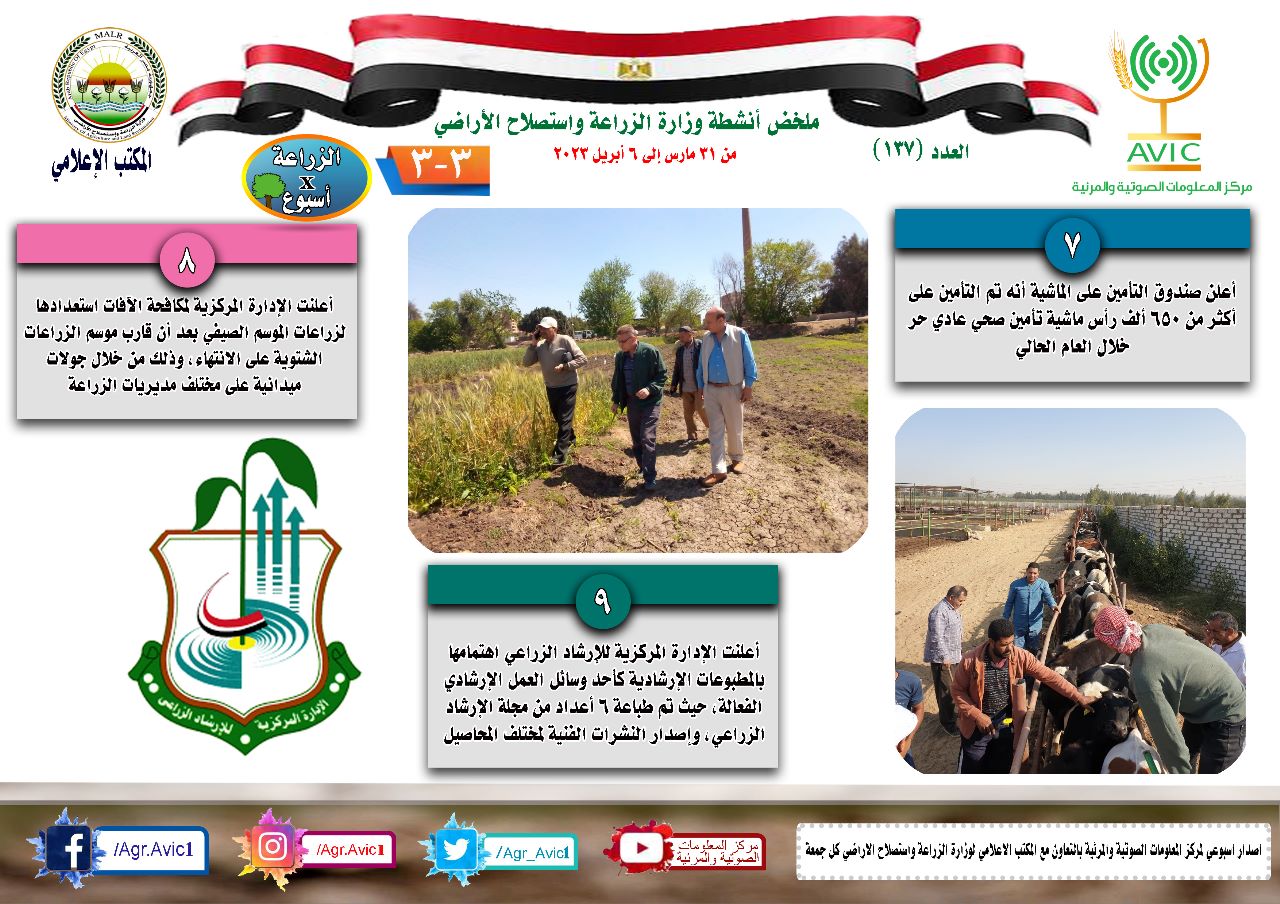 أصدر مركز المعلومات الصوتية والمرئية، التابع لوزارة الزراعة واستصلاح الأراضي، الانفوجراف الأسبوعي في نسخته رقم 137، حول الحصاد الأسبوعي لأهم أنشطة الوزارة، خلال الأسبوع الماضي في الفترة من 31 مارس وحتى 6 أبريل الجاري، وذلك بالتعاون مع المكتب الإعلامي للوزارة.