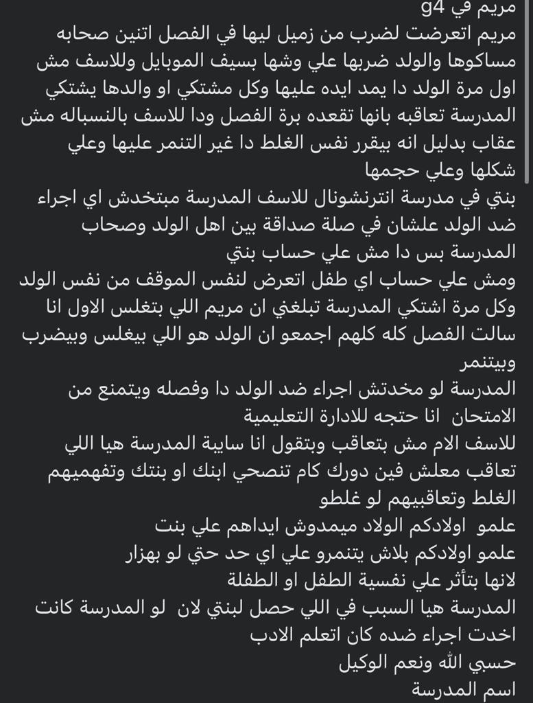 نشرت والدة طفلة منشورًا على صفحتها الشخصية فيسبوك، تحكي فيه ما تعرضت له طفلتها في المدرسة من تعدي أحد الأطفال عليها بالضرب، والتنمر ، موضحة أن المدرسة لا تتخذ أي إجراءات ضد الولد بسبب صلة القرابة التي تجمل الطفل بمسؤولين في المدرسة.