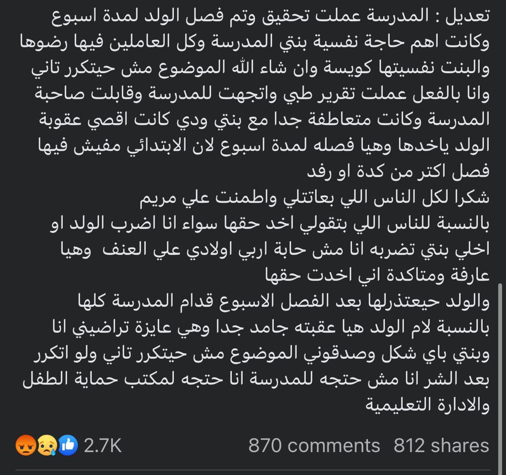 وقالت الأم في البوست: بنتي مريم في الصف الرابع الابتدائي، واتعرضت للضرب والتنمر من زميل لها في المدرسة، وهذه ليست المرة الأولى التي يتعرض فيها الطفل لزميل له في المدرسة، وعندما نشكوه عليه تكتفي المدرسة بعقابه عن طريق إرسال الطفل خارج الفصل.