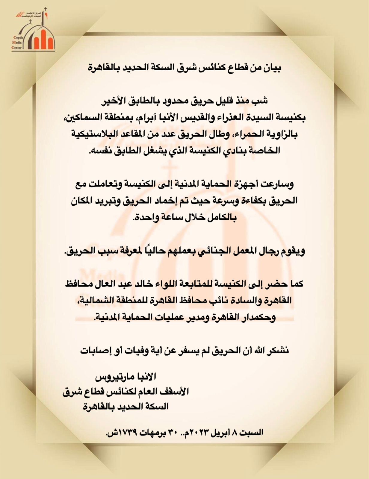 وأضاف: وسارعت أجهزة الحماية المدنية إلى الكنيسة وتعاملت مع الحريق بكفاءة وسرعة؛ حيث تم إخماد الحريق وتبريد المكان بالكامل خلال ساعة واحدة، ويقوم رجال المعمل الجنائي بعملهم حاليًا لمعرفة سبب الحريق.