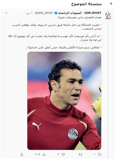 وأتم الحضري: في المستقبل لو وجدتم تصريحات باسمي تأكدوا أنها كذب صريح إلا في حالة واحدة إذا كانت متعلقة بمنتخب سوريا.