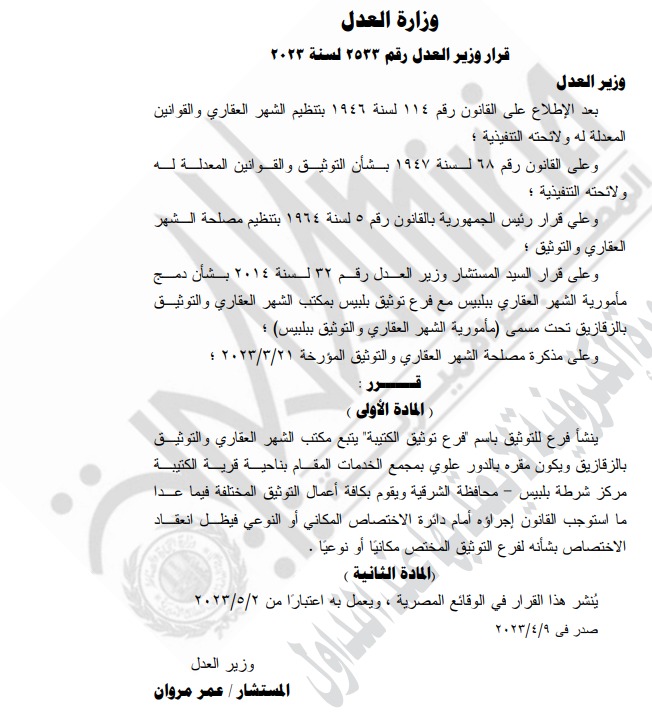 وزير العدل يصدر قرارًا بدمج مأمورية الشهر العقاري في بلبيس مع فرع الزقازيق | مستند