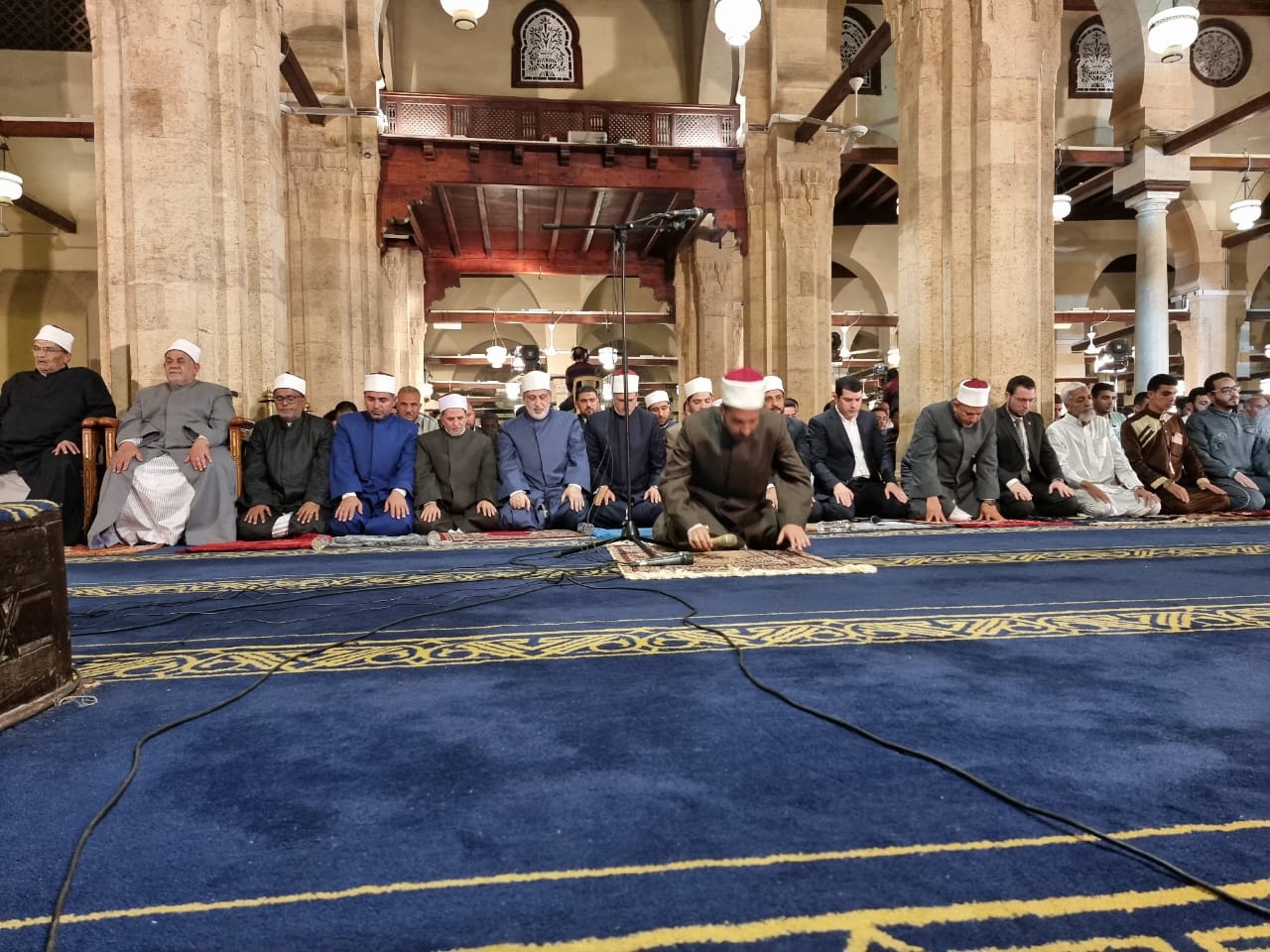 وتقدم المصلين فضيلة الدكتور محمد الضويني وكيل الأزهر، ونخبة من علماء وقيادات الأزهر الشريف، وأقيمت صلاة العشاء والتراويح من سورتي النمل والقصص برواية السوسي عن ابن عمرو البصري، ورواية ورش عن نافع المدني، ورواية قالون عن نافع المدني، ورواية الدوري عن الإمام الكسائي.