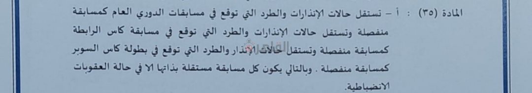 وتنص لائحة المسابقات على أن كل بطولة منفصلة بإنذاراتها وعقوباتها الإدارية، وبالتالي سيكون الإيقاف المنتظر للاعب محمد عبد المنعم ساريا في نسخة كأس مصر الجديدة، والتي سيغيب فيها عبد المنعم عن 3 مباريات وفقا للعقوبة المتوقع صدورها بحقه من إدارة المسابقات باتحاد الكرة.