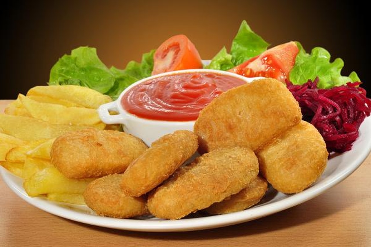 - تقدم الناجتس مع البطاطس المحمرة والكاتشب.