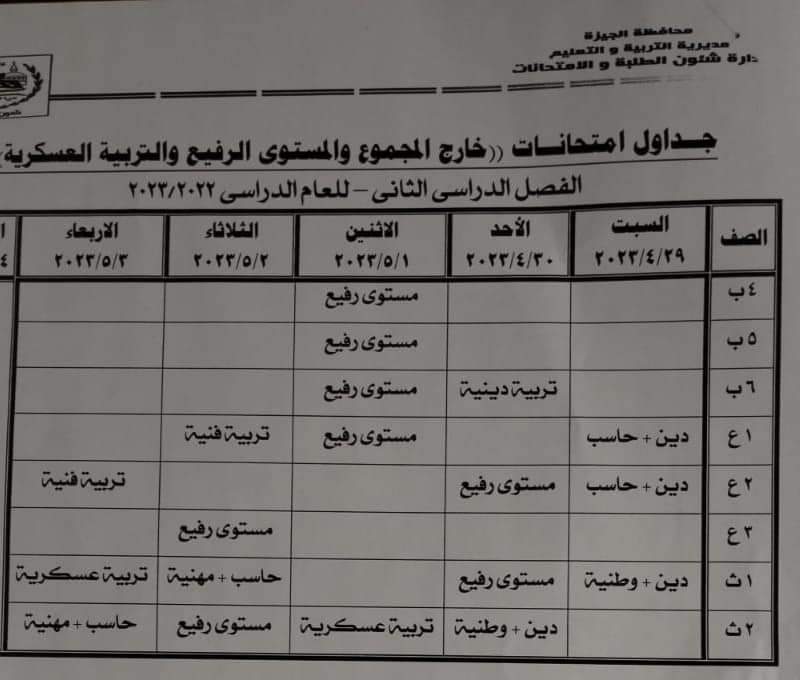 تعليم الجيزة تعلن جدول امتحانات المواد غير مضافة للمجموع بالفصل الدراسي الثاني 2023