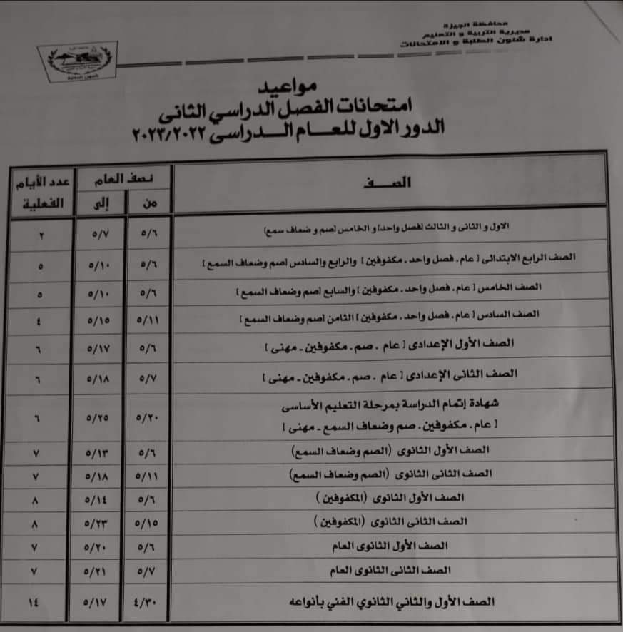 جاء ذلك بعد اعتماد اللواء أحمد راشد محافظ الجيزة اليوم الثلاثاء، جداول ومواعيد امتحانات الفصل الدراسي الثاني لجميع الصفوف بالمراحل التعليمية للعام الدراسي 2022 / 2023، التي تبدأ في 6 مايو المقبل وتنتهي 25 مايو، وذلك بحضور الأستاذ أشرف سلومة مدير مديرية التربية والتعليم بالمحافظة.