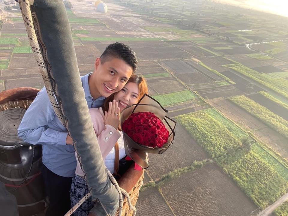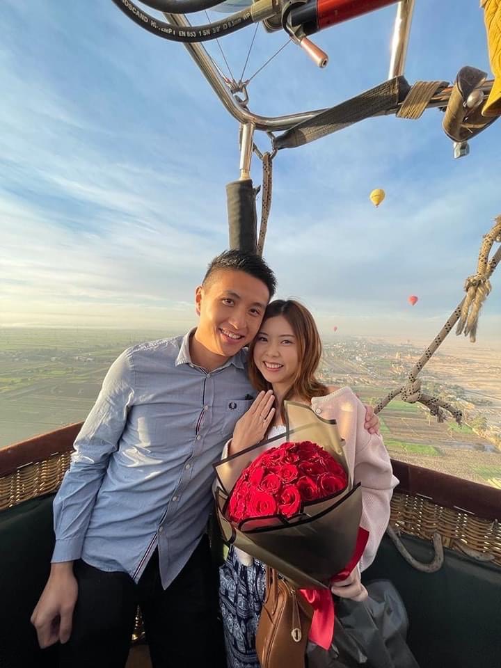 وقدم السائح الصيني لصديقته طلب الزواج أمام الجميع وأثناء طيران البالون بالأعلى في سماء الأقصر مصحوبا بخاتم الزواج وبوكيه ورد حيث قبلت العرض وسط فرحة وسعادة غامرة من جميع الموجودين حيث تم عمل زفة لهما على الطريقة المصرية من داخل البالون الطائر بسماء الأقصر لتكون لحظة مميزة في تاريخ علاقتهما لا تنسى.
