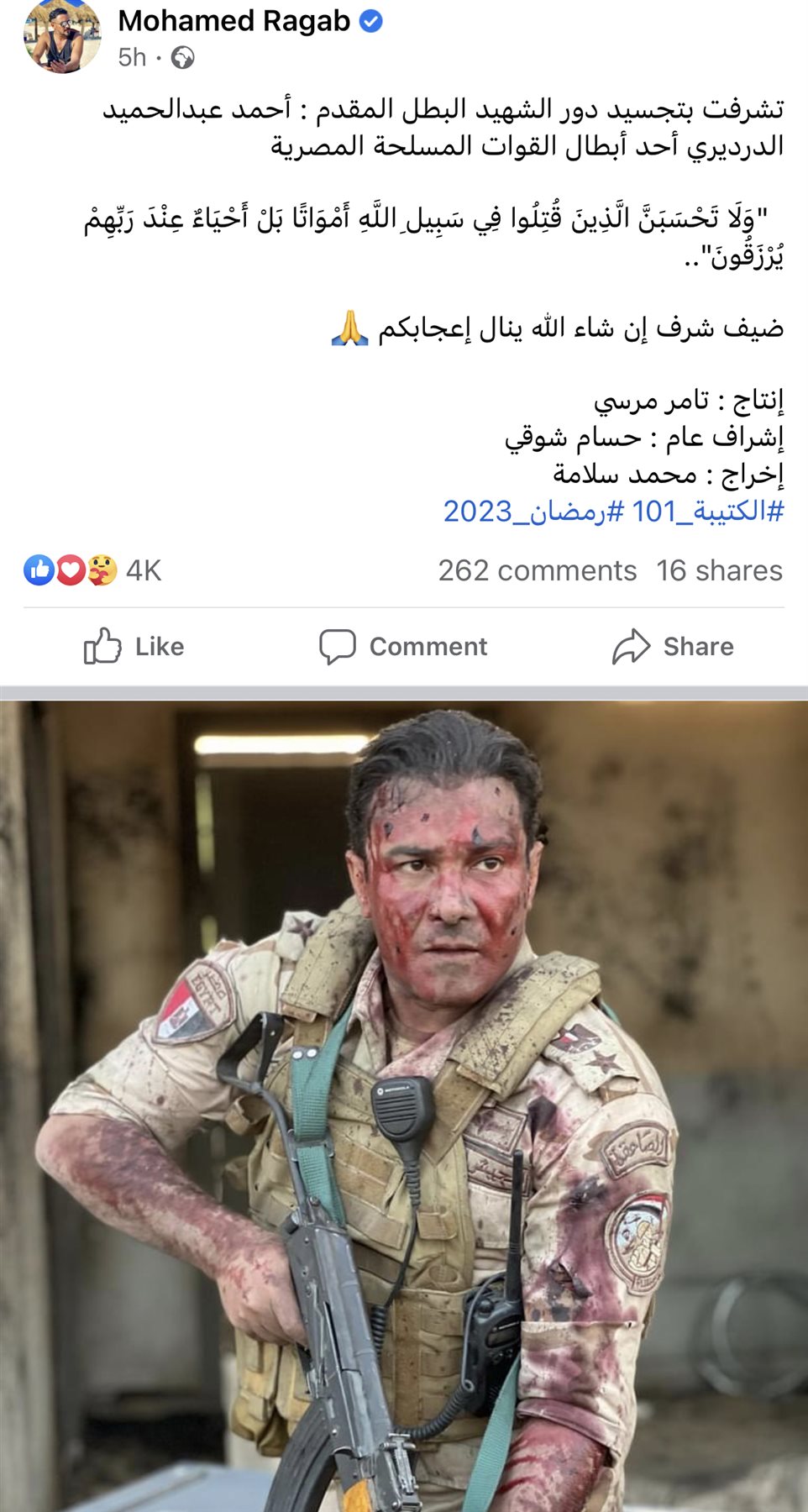 قال الفنان محمد رجب في منشور له على صفحتة بالفيس بوك تشرفت بتجسيد دور الشهيد البطل المقدم: أحمد عبدالحميد الدرديري أحد أبطال القوات المسلحة المصرية "وَلَا تَحْسَبَنَّ الَّذِينَ قُتِلُوا فِي سَبِيلِ اللَّهِ أَمْوَاتًا بَلْ أَحْيَاءٌ عِنْدَ رَبِّهِمْ يُرْزَقُونَ".