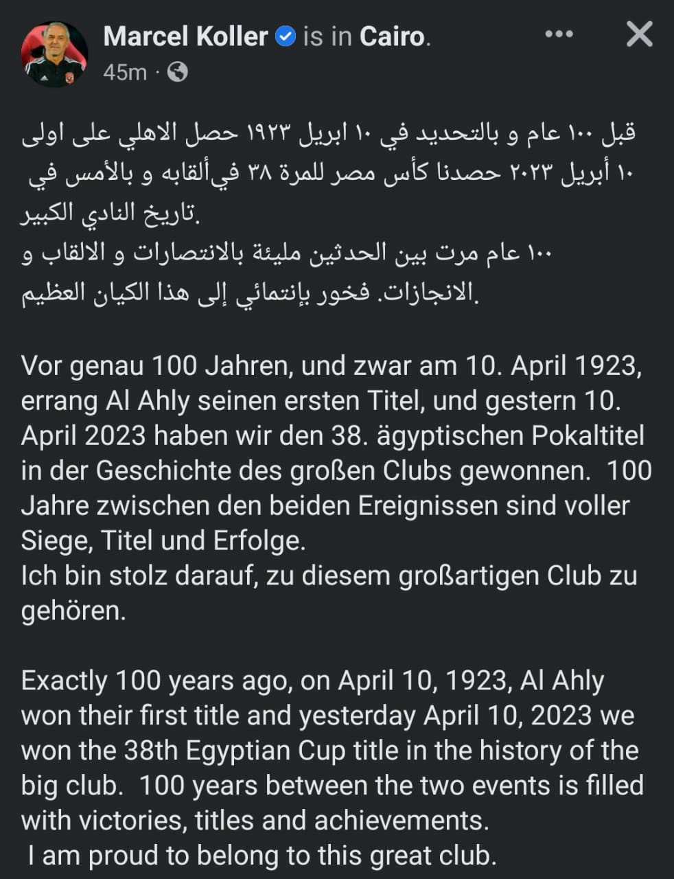 وكتب كولر: قبل 100 عام وبالتحديد في 10 أبريل 1923 حصل الأهلي على أولى ألقابه، وبالأمس في 10 أبريل 2023 حصدنا كأس مصر للمرة 38 في تاريخ النادي الكبير.