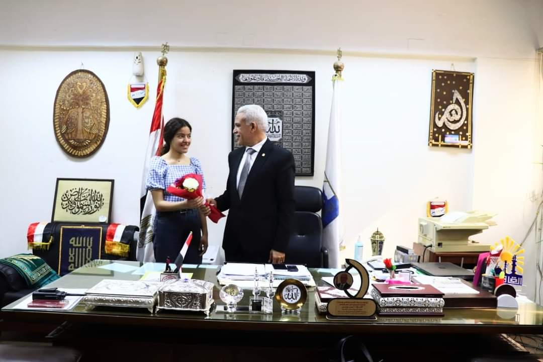 كرم أيمن موسى مدير مديرية التربية والتعليم بمحافظة القاهرة، الطالبة هنا أحمد حمزة بمدرسة الشروق التجريبية للغات التابعة لإدارة الشروق التعليمية