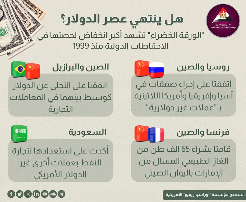 استعرض مركز المعلومات ودعم اتخاذ القرار بـ مجلس الوزراء، خلال انفوجراف المسارات المستقبلية للدولار الأمريكي، في ظل تزايد الاعتماد على "اليوان" الصيني كعملة وسيطة في المعاملات التجارية بدلًا من الدولار، وذلك استنادًا إلى تحليل نشرته مؤسسة "أوراسيا ريفيو" الأمريكية للدراسات والبحوث.