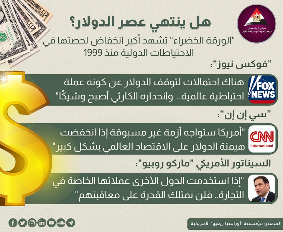 معلومات الوزراء: توقعات باستمرار تراجع حصة الدولار في الاحتياطات الأجنبية العالمية