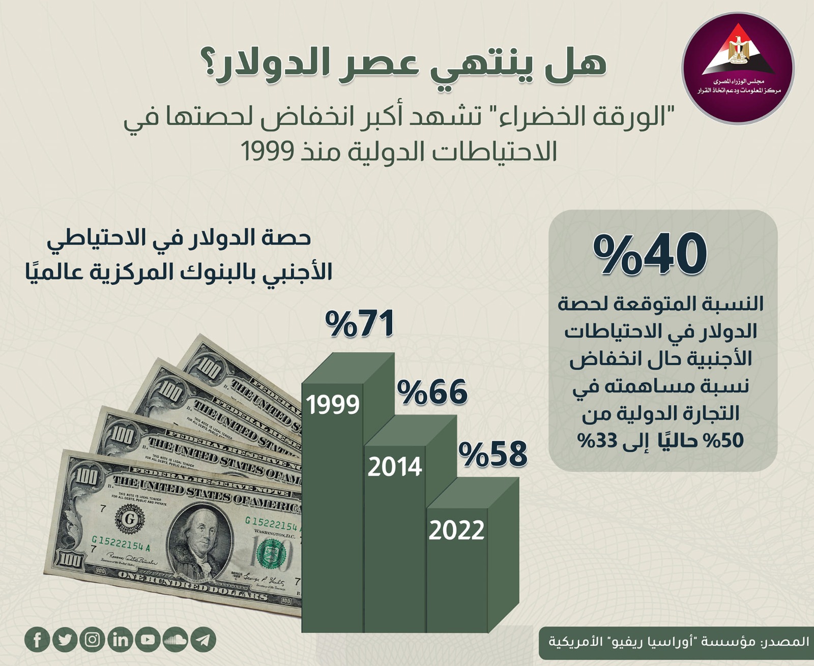 وأوضح الإنفوجراف، أن هناك توقعات بأن تستمر رحلة تراجع حصة الدولار في الاحتياطات الأجنبية العالمية، حال انخفاض نسبة مساهمته في حجم التجارة الدولية، والتي تبلغ حاليًا ٥٠ ٪ من إجمالي المعاملات التجارية العالمية، مشيرًا إلى أن حصة الدولار من الاحتياطات الدولية قد تنخفض إلى 40 ٪ حال انخفاض نسبة مساهمته في التجارة الدولية إلى الثلث بدلًا من النصف حاليًا، بما يشير إلى تأثير استمرار الاعتماد على اليوان الصيني والعملات غير الدولارية الأخرى على هيمنة "الورقة الخضراء" على الاقتصاد العالمي، ونفوذها الذي اكتسبته أعقاب الحرب العالمية الثانية خلفًا للجنيه الإسترليني.