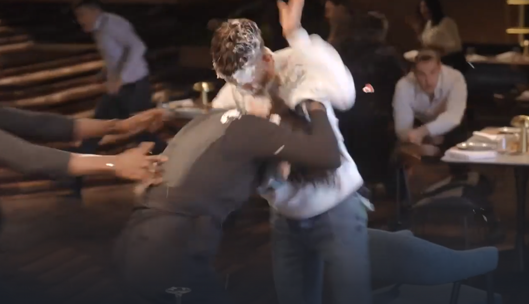 بعدما دخل الثور المطعم وكسر زجاج المطعم الذي يجلس به أحمد فتوح، ويعتقد أنه يفتتح مطعمًا تركيًا، يقوم رامز جلال الذي يجسد شخصية كبير الطهاة بالمطعم، بضرب فتوح بكعكة في وجهه، ولكن لم يصمت فتوح عن تلك الفعلة، وضرب رامز على رأسه.