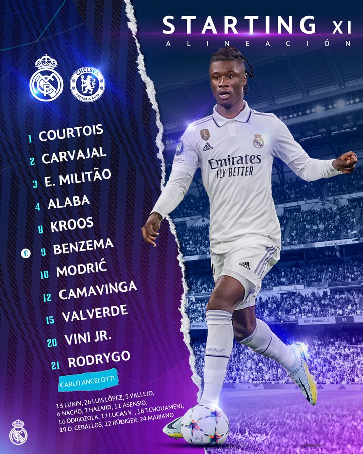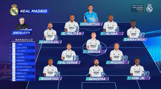 أعلن الإيطالي كارلو أنشيلوتي مدرب فريق ريال مدريد الإسباني، التشكيل الرسمي لمواجهة فريق تشيلسي الإنجليزي.