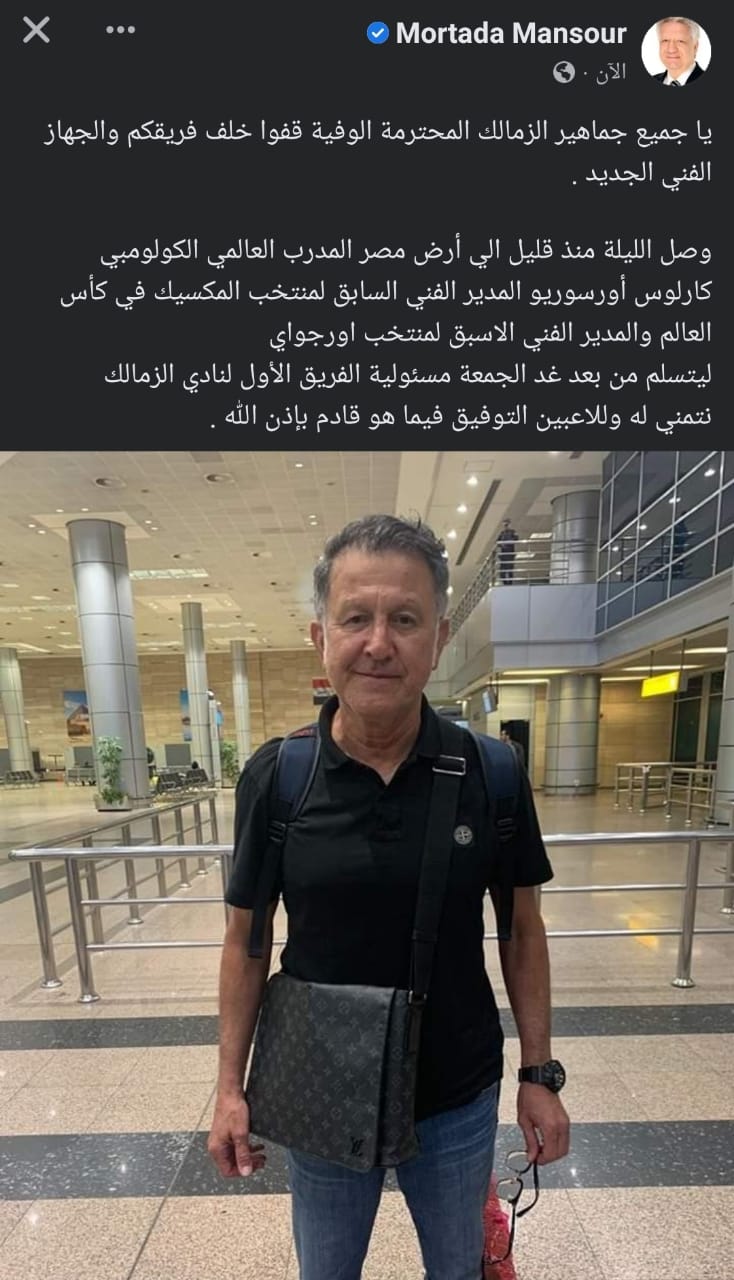 ونشر مرتضى منصور عبر حسابه الرسمي على موقع التواصل الاجتماعي فيسبوك صورة يظهر فيها الكولومبي أوسوريو بعد وصوله إلى مطار القاهرة.