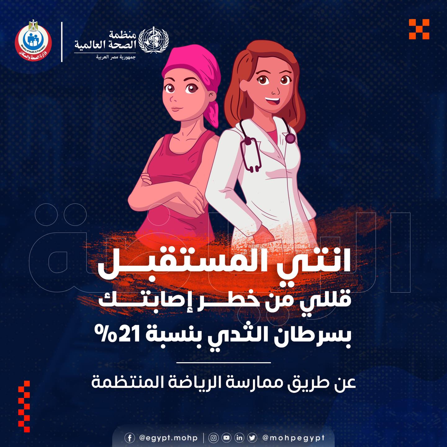 وحثت وزارة الصحة، السيدات على ممارسة الرياضة، قائلة: إنتي المستقبل، قللي من خطر إصابتك بسرطان الثدي بنسبة 21 % عن طريق ممارسة الرياضة بانتظام.