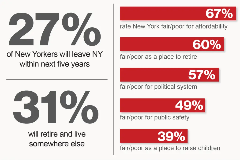 ووجد المسح، أن حوالي 31٪ من سكان المدينة يخططون لمغادرة مدينة نيويرك عندما يتقاعدون، بينما قال البعض إنهم يعتقدون أنها ليست آمنة للأطفال.
