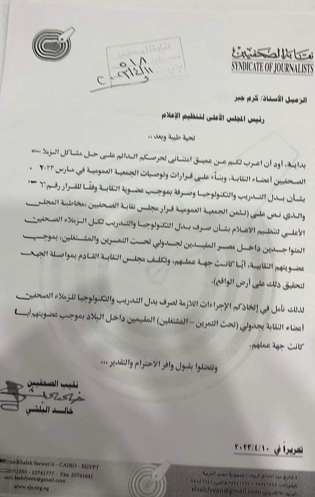 واستكمل البلشي: لذلك نأمل في اتخاذكم الإجراءات اللازمة لصرف بدل التدريب والتكنولوجيا، للزملاء الصحفيين أعضاء النقابة بجدولي تحت التمرين، والمشتغلين المقيمين داخل البلاد بموجب عضويتهم أيًا كانت جهة عملهم.
