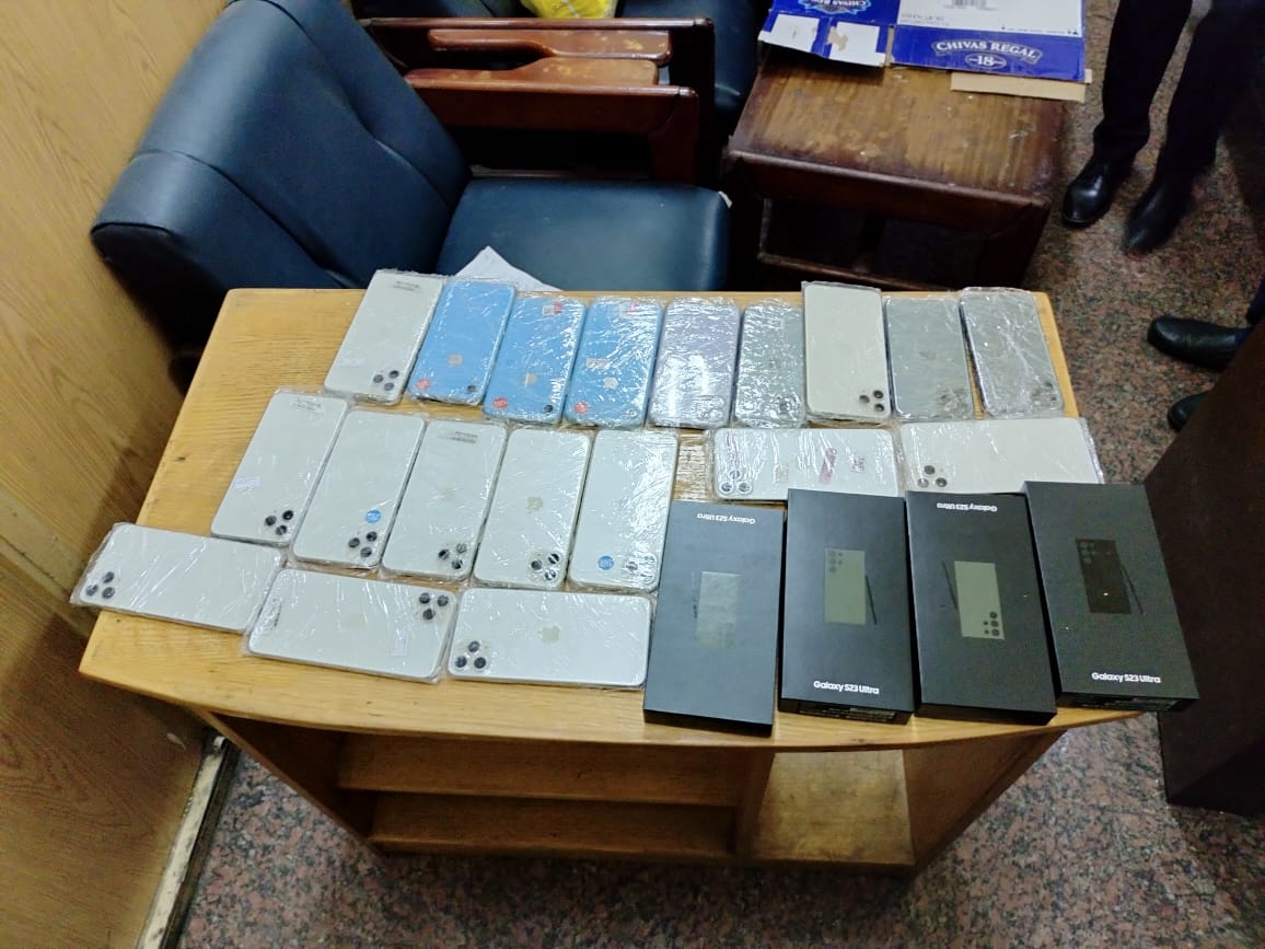 وأسفر التفتيش عن ضبط عدد من التليفونات المحمولة مخبأة داخل حزام ملفوف على وسط الراكب أسفل ملابسه، وعدد آخر من التليفونات داخل الجاكيت الذي يرتديه الراكب، وتشكلت لجنة من محمود عبد الرؤوف وعلي شرقاوي ومحمد عادل وياسمين جمال، مآمير الجمرك، تحت إشراف علاء شحاتة مدير الحركة، وذلك لجرد وعد وتصنيف وتحريز المضبوطات التي بلغ عددها 19 تليفون محمولًا ماركة iPhone و4 تليفون ماركة samsung بإجمالي 23 تليفون.
