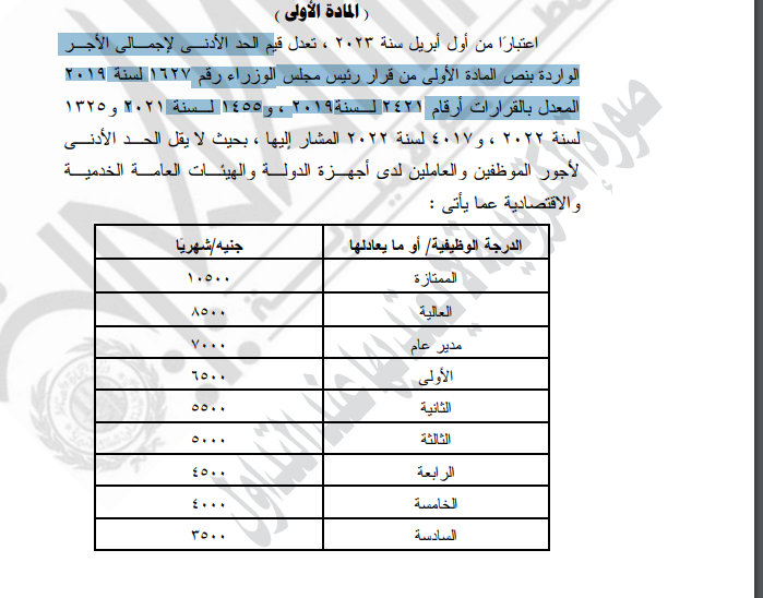 ونص مشروع القرار على أنه بدءا من أول أبريل عام 2023، تُعدل قيم الحد الأدنى للأجور، بحيث لا يقل الحد الأدنى لأجور الموظفين والعاملين لدى أجهزة الدولة والهيئات العامة الخدمية والاقتصادية عن 10500 جنيه/ شهريًا بالنسبة للدرجة الوظيفية الممتازة أو ما يعادلها، وألا يقل أجور العاملين عن 8500 جنيه/ شهريًا بالنسبة للدرجة الوظيفية العالية أو ما يعادلها، و7000 جنيه/ شهريًا بالنسبة لدرجة مدير عام أو ما يعادلها.