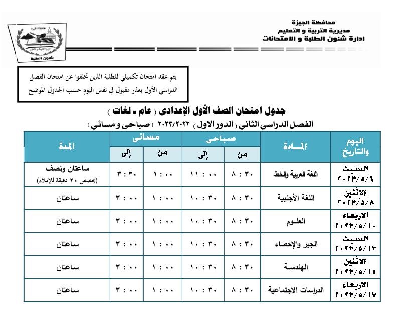 ننشر جدول امتحانات أولى إعدادي الترم الثاني 2023 بالجيزة