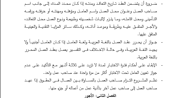 كما أجاز القانون أن يحرر عقد العمل باللغة العربية ولغة العامل إذا كان العامل أجنبيًا ولا يجيد اللغة العربية، وفى حالة الاختلاف في التفسير يعمل بعقد العمل المحرر باللغة العربية.