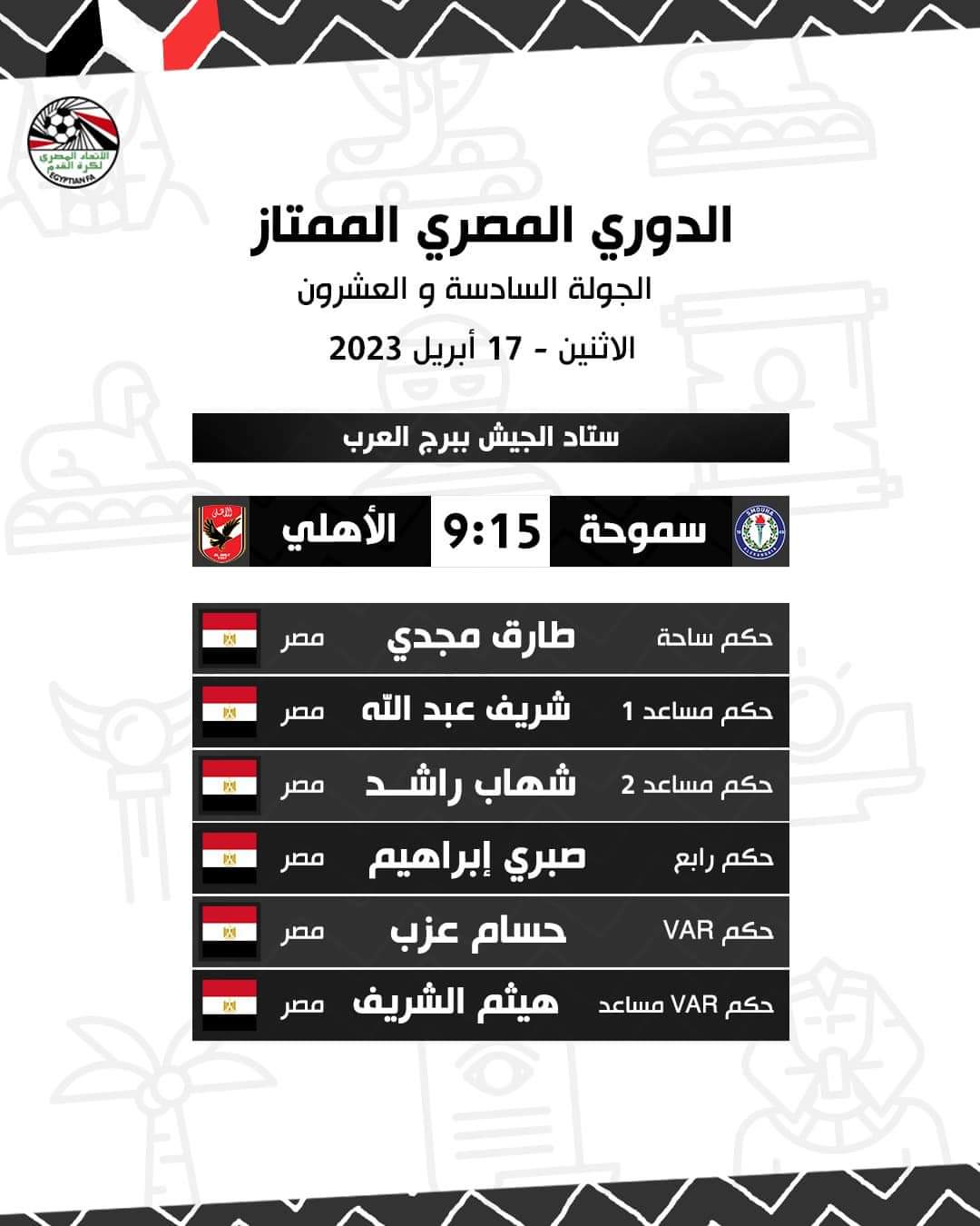 وأسندت لجنة الحكام مباراة الأهلي وسموحة إلى طارق مجدي، ويعاونه شريف عبد الله مساعد أول، شهاب راشد مساعد ثاني، وصبري إبراهيم حكما رابعا، وعلى تقنية الفيديو يتواجد حسام عزب ويساعده هيثم الشريف.