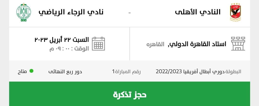 طرحت شركة تذكرتي، تذاكر مباراة الأهلي والرجاء المغربي، في إطار ذهاب ربع نهائي دوري أبطال إفريقيا للموسم الحالي.