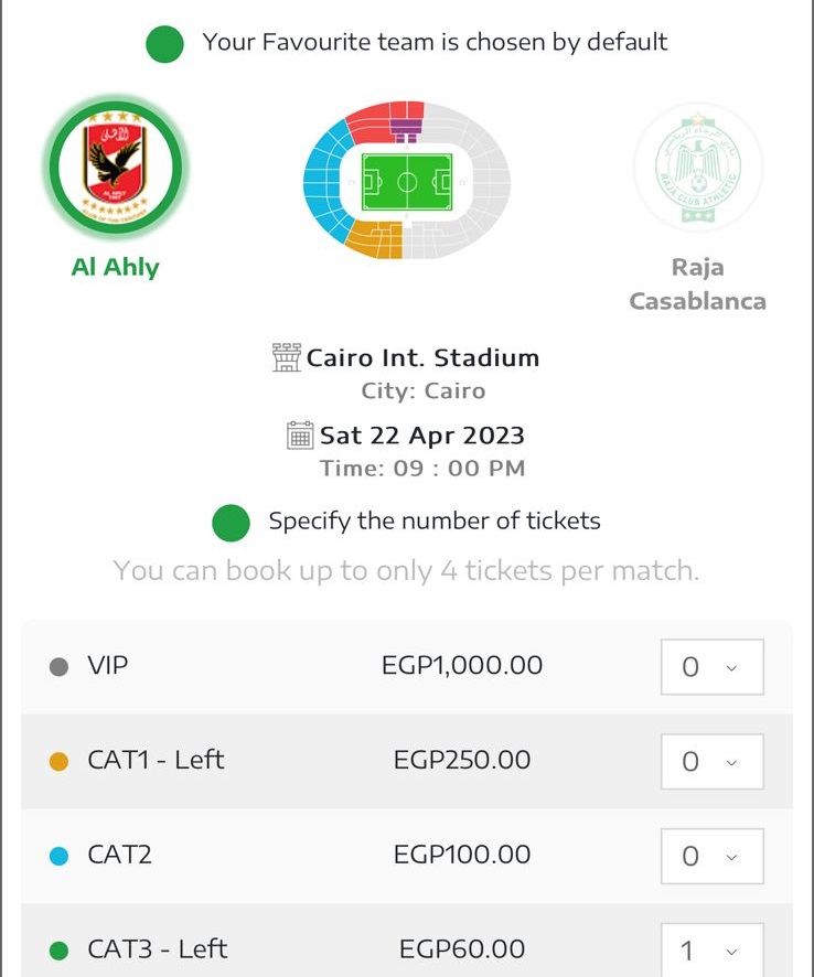 وجاءت أسعار تذاكر مباراة الأهلي والرجاء المغربي، على النحو التالي: