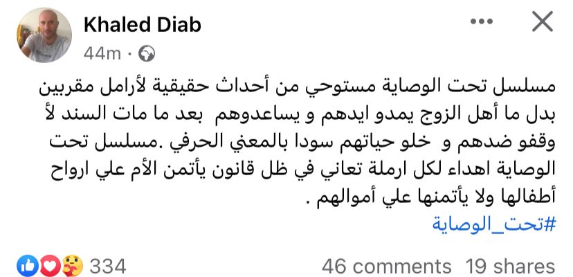 وكتب خالد دياب مؤلف مسلسل تحت الوصاية، عبر حسابه الشخصي بموقع فيس بوك: مسلسل تحت الوصاية مستوحى من أحداث حقيقية لأرامل مقربين، بدل ما أهل الزوج يمدوا أيديهم ويساعدوهم بعد ما مات السند، لأ وقفوا ضدهم وخلوا حياتهم سودا بالمعنى الحرفي.