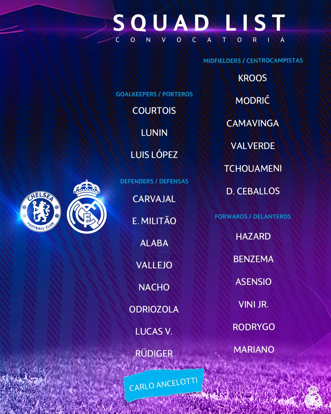 وشهدت قائمة ريال مدريد المستدعاه لمولجهة تشيلسي في دوري أبطال أوروبا، عودة كل من فينسيوس جونيو والالماني توني كروس بعد غيتبهم في المباراة الماضية أمام فريق قادش في الدوري الإسباني، وشهدت أيضًا تواصل غياب فيرلاند ميندي.