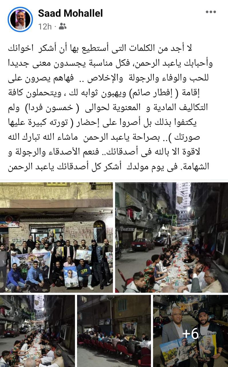 واختتم الأب رسالته قائلا: بصراحة يا عبد الرحمن ما شاء الله تبارك الله لاقوة إلا بالله في أصدقائك.. فنعم الأصدقاء والرجولة والشهامة، في يوم مولدك أشكر كل أصدقائك يا عبد الرحمن.
