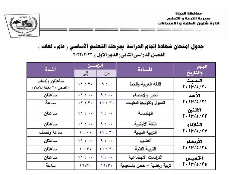 جدول امتحانات الصف الثالث الإعدادي الترم الثاني 2023 بالجيزة