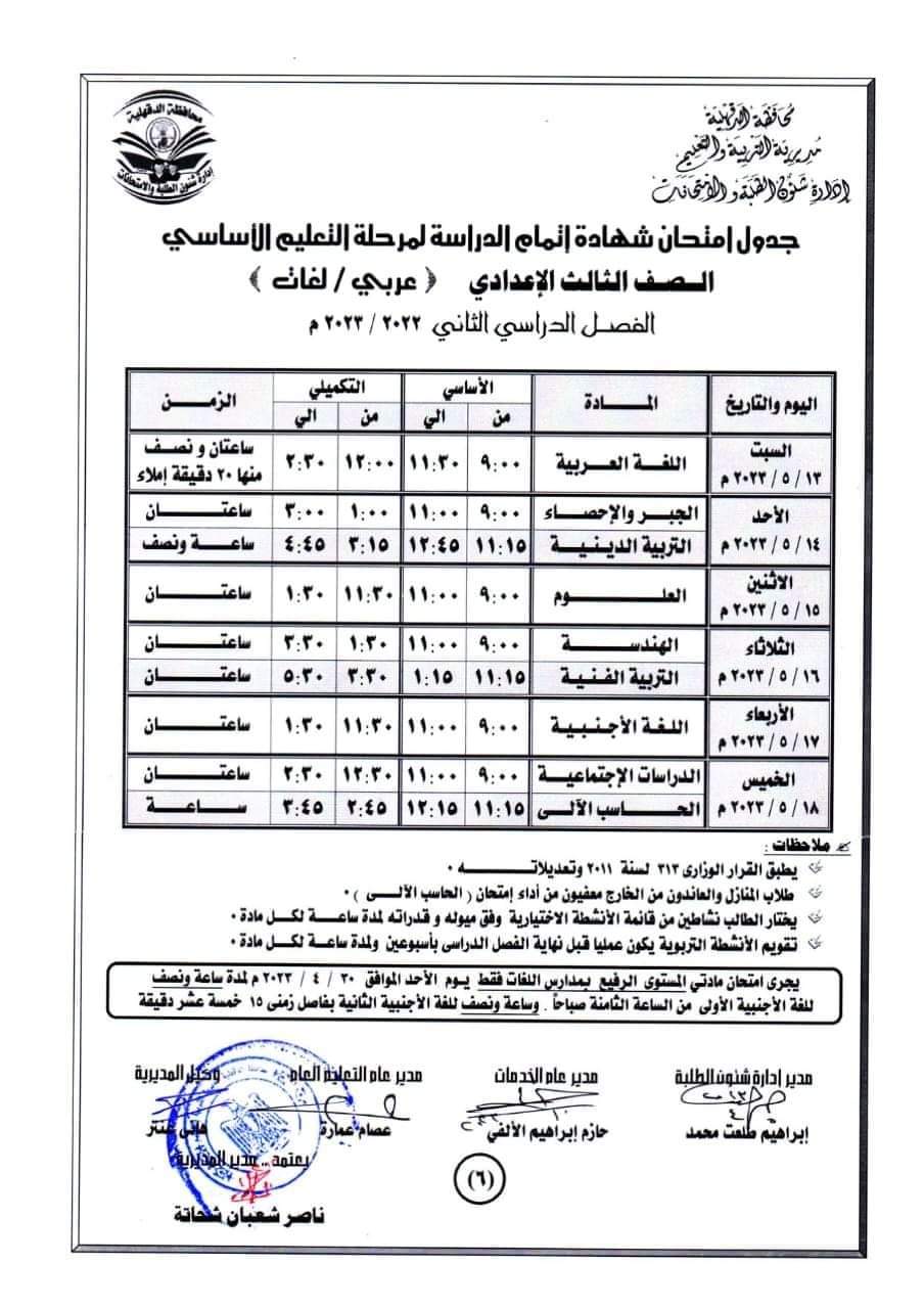 جدول امتحانات الصف الثالث الإعدادي بالدقهلية
