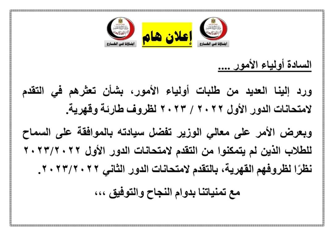 أعلنت وزارة التربية والتعليم، موافقة الدكتور رضا حجازي وزير التربية والتعليم على الموافقة للطلاب الذين لم يتمكنوا من تسجيل دخول امتحانات الطلاب في الخارج عن الترم الأول للعام الدراسي الحالي، لظروف قهرية، بدخول امتحانات الدور الثاني عن نفس السنة الدراسية الحالية.